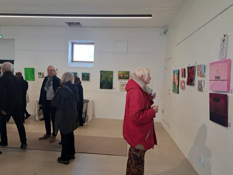 Det finns alltid ett par av de utställande konstnärerna på plats som gärna visar och förklarar sin konst. Extra många så klart på vernissagen.