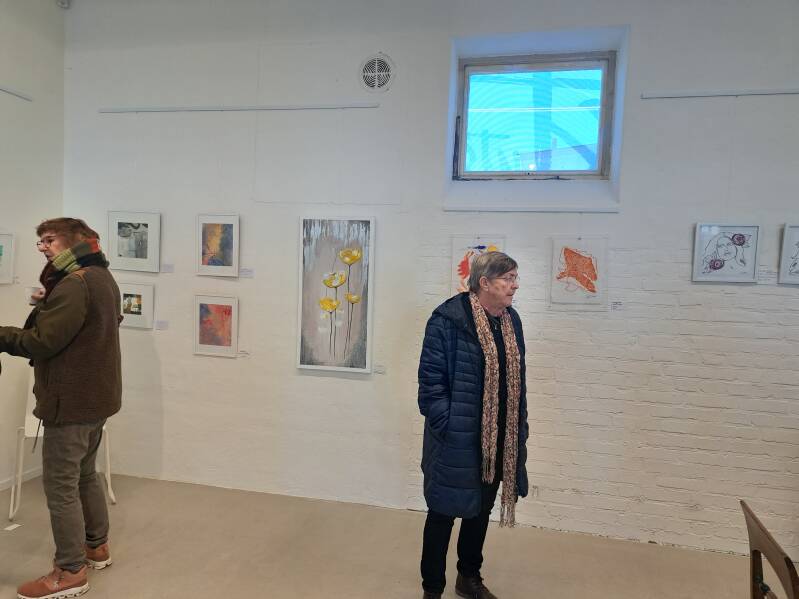 Der er altid et par af de udstillende kunstnere på stedet, som gerne viser og forklarer deres kunst. Ekstra mange selvfølgelig ved åbningen.