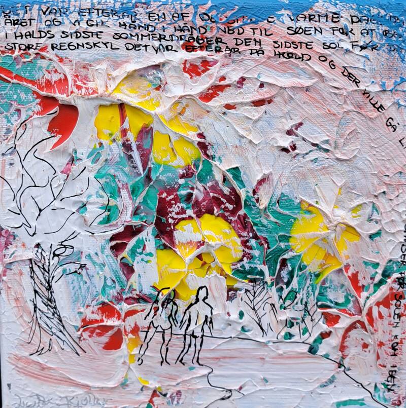 They are all a kind of small landscape painted on the spot in nature or when it is too cold inside a window. They are painted during my semester and residence. These pictures are painted either at Odsherred or Viborg at Hald Hovedgård, which is a manor house. Small stories and poems have been written on some of them from Hald since it is a home for writers and illustrators.